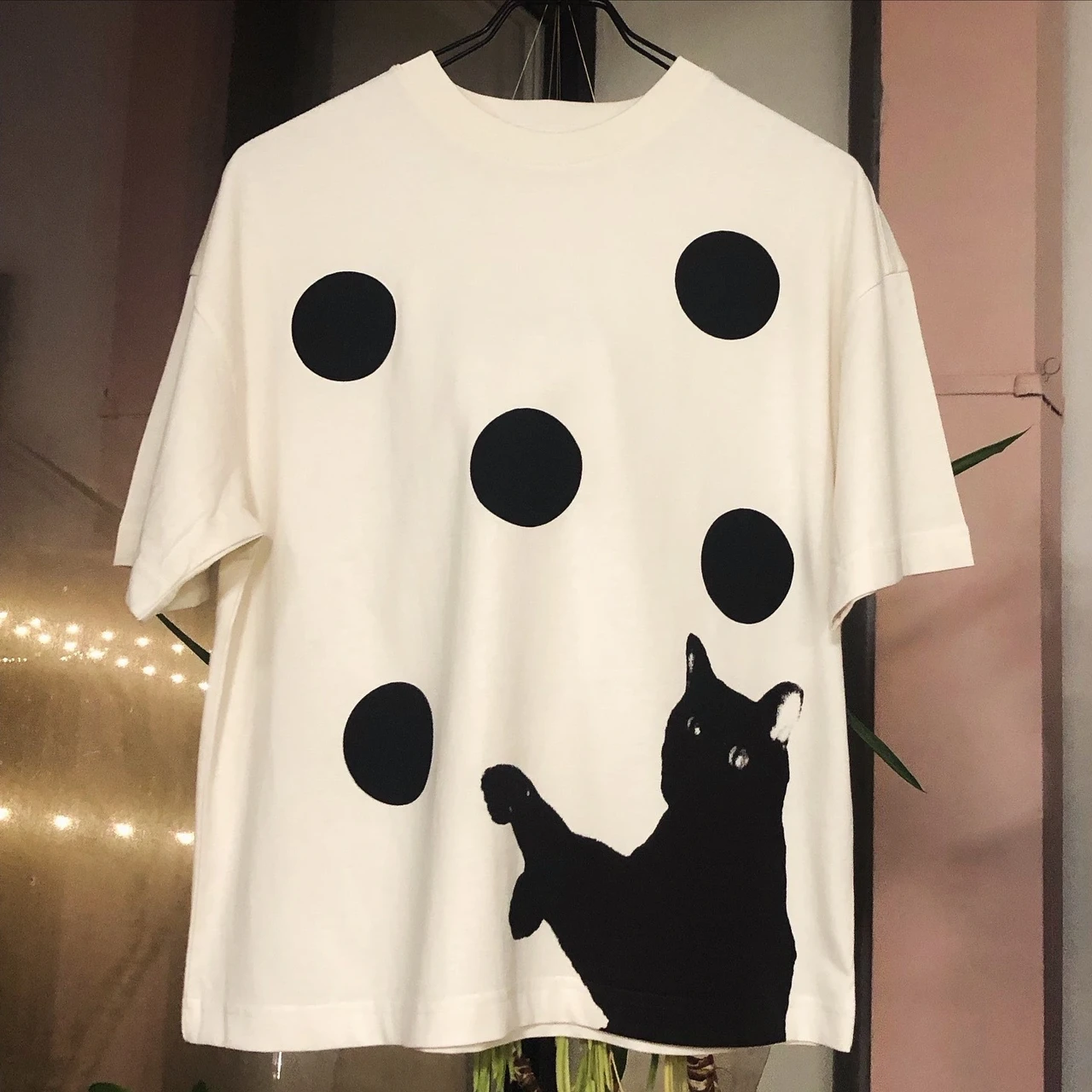 Bring a touch of playful minimalism to your wardrobe with this Cat and Polka Dots Tee.